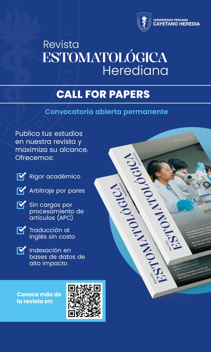 La Revista Estomatológica Herediana (REH) mantiene abierta de manera permanente su convocatoria para la recepción de artículos científicos, invitando a docentes, investigadores y profesionales del área a enviar manuscritos originales que contribuyan al desarrollo del conocimiento en estomatología y salud pública odontológica.