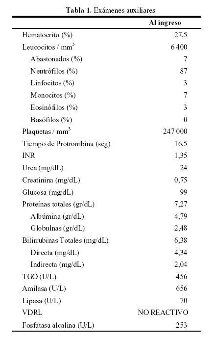 Buen estado general, palidez moderada, ictericia hasta abdomen, no tenía edemas. Tórax, pulmones y corazón normales. En abdomen había leve dolor a la palpación profunda en el epigastrio, y cicatriz de la colecistectomía; genitourinario normal. Al examen neurológico, estaba lúcida y orientada, no había signos meníngeos ni signos de focalización, tono muscular y los reflejos osteotendinosos eran normales.