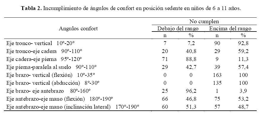 Nosotros realizamos un estudio con el objetivo de determinar los ángulos de confort en niños de primaria y de ese modo entender si el mobiliario escolar es inadecuado, dado que los ángulos se originan directamente por el asiento y mesa de estudio. Para la evaluación se utilizaron los ángulos de confort de Wisner validado y respaldado por la Sociedad de Ergonomía de la Lengua Francesa (SELF) y son utilizados por la Sociedad Ergonomica del Perú.