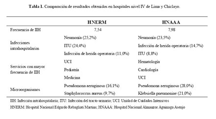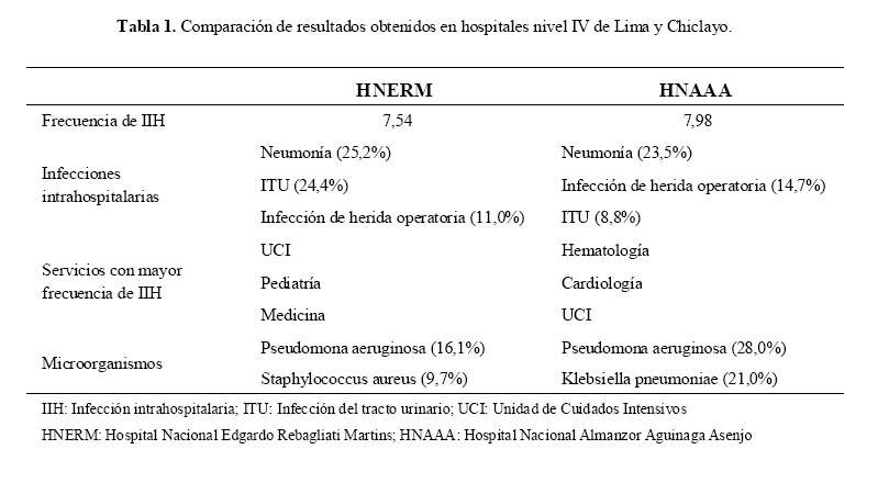 El Hospital Nacional Almanzor Aguinaga Asenjo, es un hospital de nivel III-1, perteneciente a EsSALUD y localizado en Chiclayo, cuenta con 445 camas y tiene acceso a antibióticos de bajo y amplio espectro. La frecuencia de infecciones intrahospitalarias, fue 7,98% (5). La más alta tasa de infecciones intrahospitalarias la tuvo el servicio de Hematología (28,5%) por el uso de catéteres Port, seguido de Cardiología (25%) por neumonía intrahospitalaria, y los principales microorganismos implicados fueron Pseudomona aerugionosa (27,6%) y Klebsiella pneomuniae (21%)(Tabla 1).