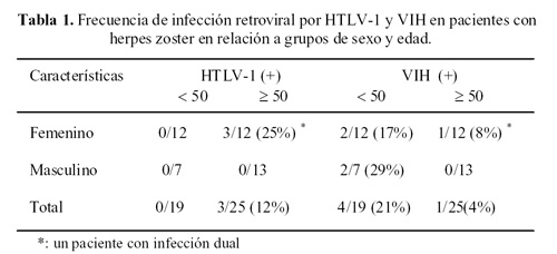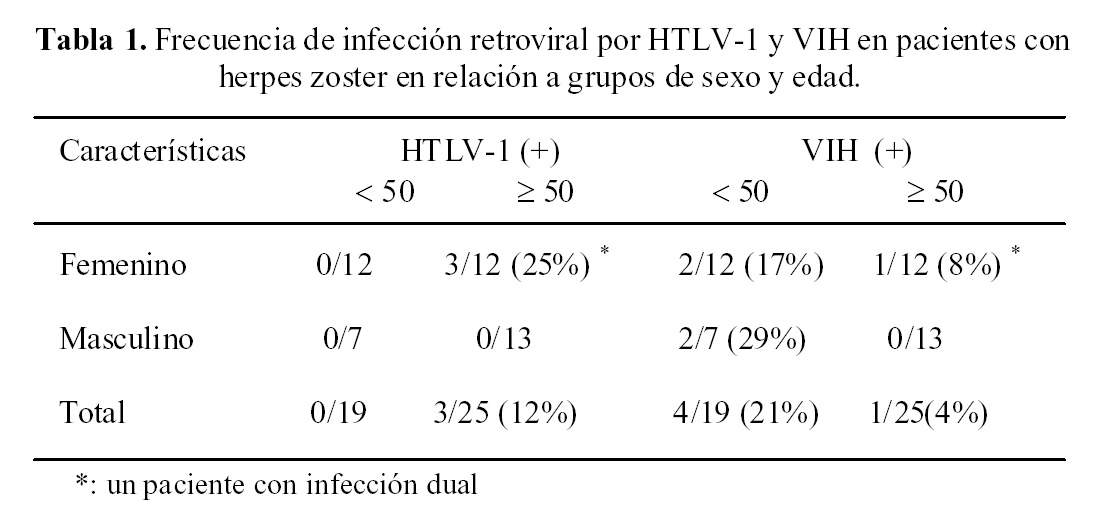 En este estudio, la tasa de infección para HTLV-1 en mujeres mayores de 50 años afectadas por herpes zoster fue 25% (3/12), distinto a la infección por VIH que se encontró casi exclusivamente en pacientes menores de 35 años, con una tasa de 26% (5/19). Este último resultado se asemeja al encontrado en un estudio que evaluó la frecuencia de infección por VIH en pacientes con herpes zoster menores de 50 años, donde 23,8% de pacientes fueron positivos para VIH (7).