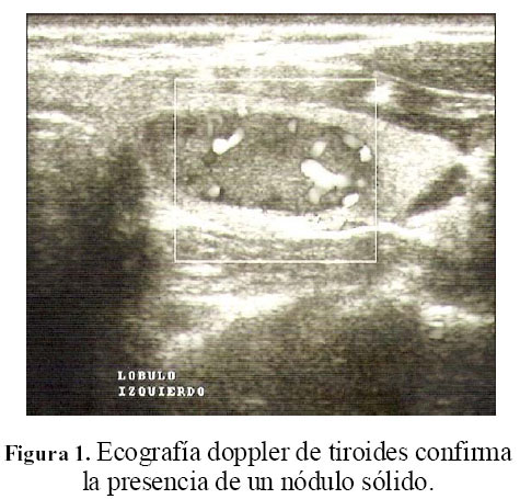 Mujer de 34 años, sin antecedentes de enfermedad tiroidea, que acudió por presentar aumento difuso de la glándula tiroides. La madre tenía hipotiroidismo postquirúrgico (tiroidectomía total por nódulo benigno). El examen físico mostró un bocio difuso (60 gr.) y presencia de un nódulo palpable (1,5 cm) en el polo inferior del lóbulo izquierdo. Los análisis de laboratorio fueron TSH 0,89 µIU/dL (VN: 0,4-4) y T4 libre 1,31 ng/dL (VN: 0,8-1,9). La ecografía doppler de tiroides confirmó la presencia de un nódulo sólido con flujo sanguíneo incrementado en el lóbulo izquierdo (Figura 1). La biopsia por aspiración con aguja fina (BAAF) fue normal, y los anticuerpos anti-TPO fueron 55,8 IU/mL (VN: < 35).