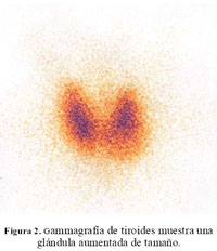 Seis meses después presentó tremor fino de manos, intolerancia al calor, baja de peso y palpitaciones. El nuevo perfil tiroideo fue TSH 0,01 µIU/dL y T4 libre 4,59 ng/dL. La gammagrafía de tiroides mostró una glándula aumentada de tamaño con hipercaptación difusa, a predominio de la zona central de ambos lóbulos (Figura 2). La paciente recibió tratamiento con tiamazol 20mg una vez por día y propanolol 20mg tres veces al día. Después de 6 meses, la paciente no presentaba molestias. Su último perfil tiroideo fue TSH 0,01 µIU/dL y T4 libre 1,27 ng/dL. La paciente recibió 12mCi de yodo radioactivo sin presentar complicaciones.