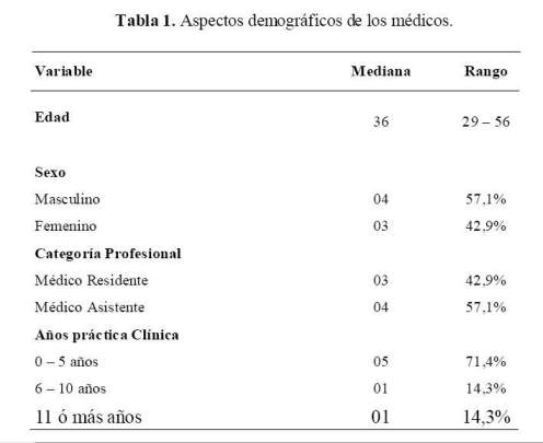 De un total de ocho médicos que trabajan en el servicio de endocrinología, siete médicos respondieron la encuesta, previo consentimiento verbal. La tabla 1 resume los aspectos demográficos de los médicos.