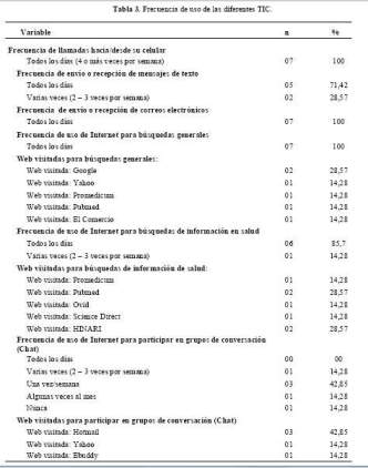 - Frecuencia de uso de las diferentes TIC. Se les preguntó a los participantes acerca de la frecuencia de uso de computadoras, Internet para búsqueda de información relacionada con diabetes, correo electrónico, chat y el uso de celulares para llamar, enviar o recibir mensajes.
