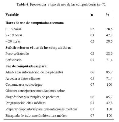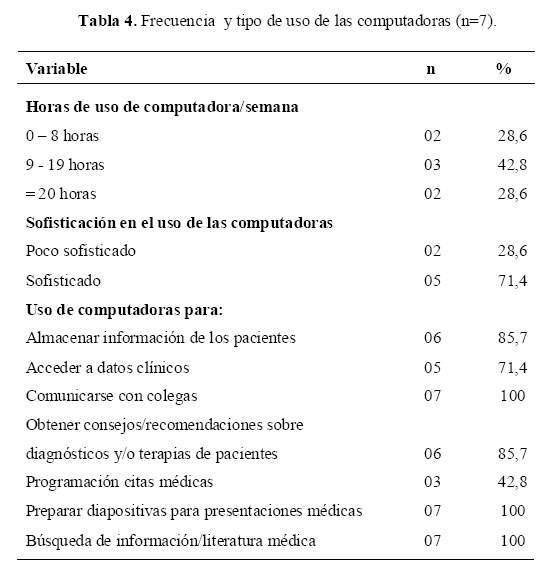 La tabla 4 resume la frecuencia y tipo de uso de las computadoras por parte de los médicos endocrinólogos.