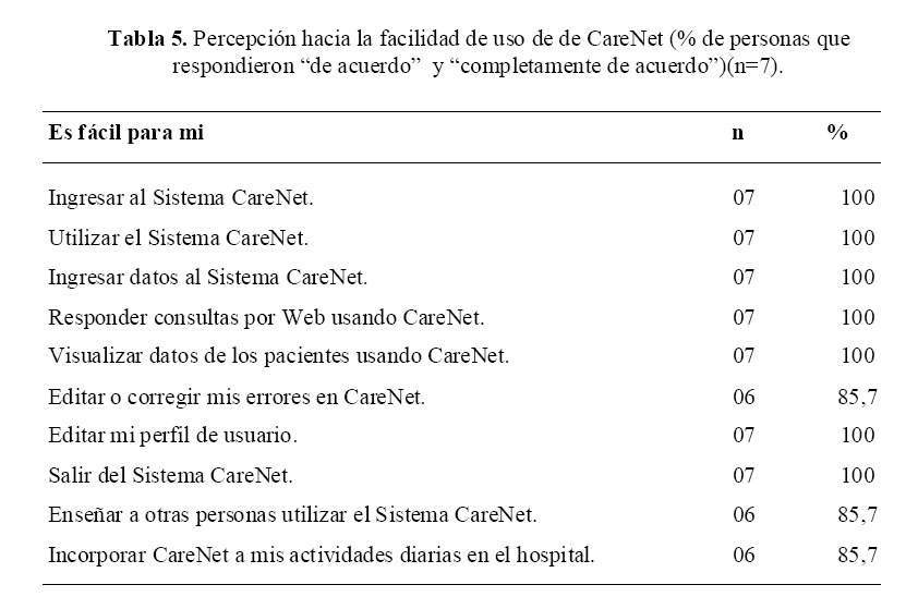 La tabla 5 resume la percepción de los médicos con respecto a la facilidad de uso del sistema CareNet.