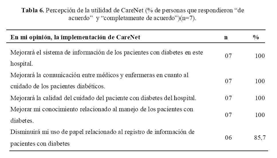 En cuanto a la percepción de utilidad, la totalidad de médicos considera que CareNet mejorará el sistema de información de pacientes, mejorará la comunicación entre médicos y enfermeras en cuando al cuidado de pacientes con diabetes, mejorará la calidad del cuidado de los pacientes con diabetes, y mejorará el conocimiento del médico relacionado al manejo de pacientes con diabetes.