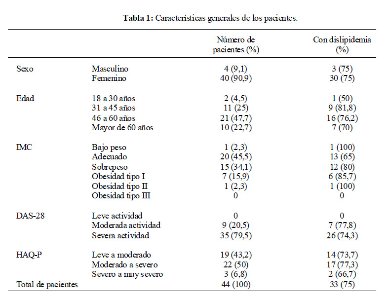 El objetivo principal del estudio fue determinar la frecuencia de dislipidemia en pacientes con AR atendidos en un hospital general. Los objetivos secundarios fueron: describir la frecuencia de dislipidemia según el sexo, la edad, el índice de masa corporal (IMC), la severidad de la actividad de la AR y la limitación funcional, y determinar el perfil lipídico de estos pacientes.