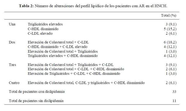 Encontramos en nuestro estudio que los pacientes con dislipidemia presentaron diversas formas de alteración en el perfil lipídico sin guardar un patrón uniforme por lo que el enfoque del tratamiento para la dislipidemia sería diferente en cada paciente y se podría prevenir algún tipo de suceso cardiovascular. Es así que 12,1% de los pacientes con dislipidemia presentó triglicéridos elevados y C-HDL disminuido. Las alteraciones de estos dos componentes del perfil lipídico son características de la dislipidemia del síndrome metabólico. Este último es un factor de riesgo para enfermedades cardiovasculares aterogénicas (10). La presencia del síndrome metabólico en pacientes con AR podría ser materia de investigación para futuros estudios.