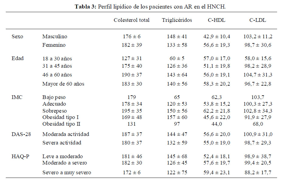 La dislipidemia en la AR parece ser dependiente de la actividad de la enfermedad, según la revisión de artículos realizada por Nurmohamed (20). El valor del colesterol total disminuye y más aún el de C-HDL si existe mayor actividad conduciendo hacia un índice aterogénico mayor. En nuestro estudio, también ocurrió este comportamiento tal como se muestra en la tabla 3. La disminución de las medias en estos niveles fue mayor que las de C-LDL y triglicéridos. Sin embargo, no se pudo evaluar si existe significancia estadística entre la actividad de la enfermedad y la presencia de dislipidemia porque ningún paciente tuvo actividad leve. Esto se debería posiblemente a que el HNCH es un establecimiento de salud de referencia de tercer nivel donde acuden pacientes con patología compleja.