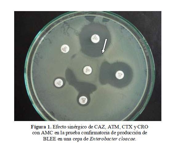 Se empleó el método del doble disco descrito por Drieux (15); para ello, se prepararon suspensiones bacterianas en solución salina fisiológica estéril al 0,85% con turbidez comparada al tubo 0,5 MacFarland y luego se inocularon en agar Mueller-Hinton (Merck). La prueba consistió en colocar un disco de AMC (20/10 µg) en el centro de las placas, y alrededor de éste se colocaron, a una distancia de 20 mm, discos de CAZ (30 µg), CTX (30 µg), CRO (30 µg) y ATM (30 µg). Las placas fueron luego incubadas por 24 horas a 37ºC. La presencia de BLEE se confirmó por el efecto sinérgico del inhibidor (efecto tapón de corcho en la figura 1), en la forma de ampliación del halo en uno o varios de los betalactámicos incluidos en la prueba (2).