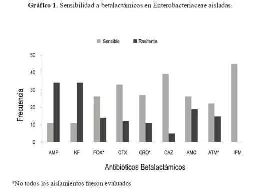 La susceptibilidad de las enterobacterias aisladas a los betalactámicos, se muestra en el gráfico 1.