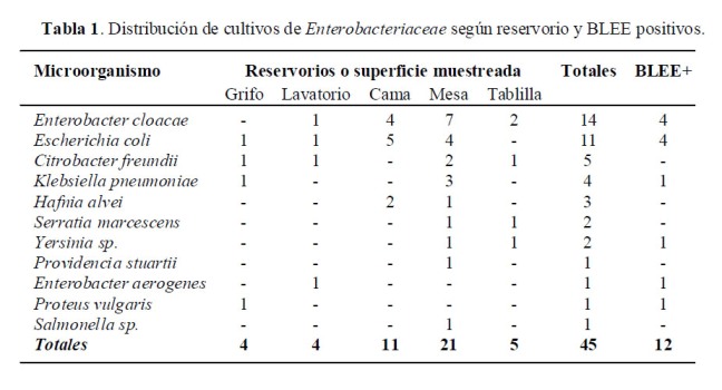 Estos resultados, además, refuerzan la importancia de una apropiada limpieza y desinfección de las superficies y sobre todo del lavado de manos, sobre todo después del contacto con reservorios potencialmente contaminados. Este es probablemente, en nuestro país, el primer reporte de enterobacterias aisladas de superficies o reservorios intrahospitalarios con demostrada capacidad de producir BLEE.
