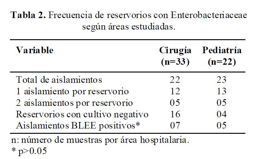 En el análisis estadístico, para determinar la frecuencia de positividad de enterobacterias en los reservorios y de BLEE en los cultivos, se empleó el programa SPSS v15. Se empleó el chi cuadrado para estimar la asociación entre las áreas hospitalarias y los cultivos productores de BLEE, considerándose estadísticamente significativo un p<0,05.