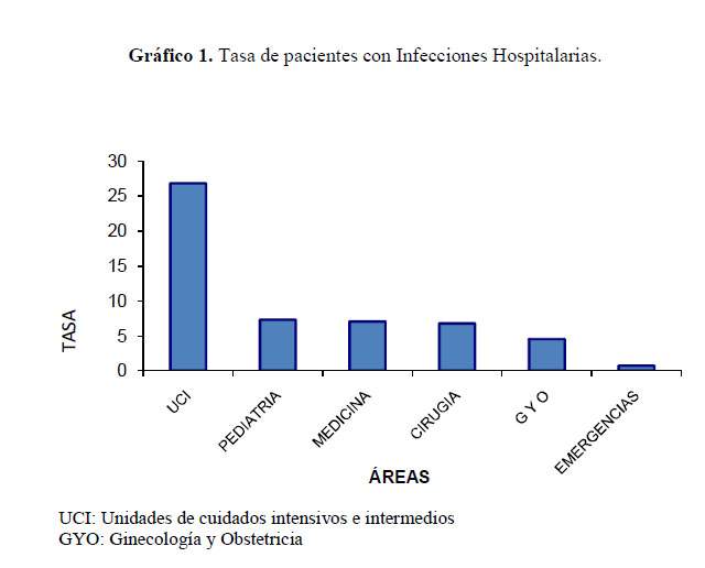 De acuerdo a los resultados del estudio el área con mayor prevalencia de infecciones hospitalarias fue cuidados intensivos y dentro de ésta, los servicios de cuidados intensivos pediátricos y cuidados intermedios, pudiendo explicarse porque en estos servicios se utiliza con mayor frecuencia métodos invasivos en el manejo del paciente, como ventiladores mecánicos, catéteres venosos centrales, vías periféricas, catéteres urinarios, etc.; incluso se observa que dentro de las neumonías nosocomiales un gran porcentaje (31,25%) se asocia a ventilador mecánico y dentro de las infecciones hospitalarias del tracto urinario más de la mitad de pacientes (61,3%) portaban catéteres urinarios; lo que podría estar relacionado al pobre cumplimiento de las normas de bioseguridad, puesto que estos dispositivos son de manipulación del personal de salud (12-15).