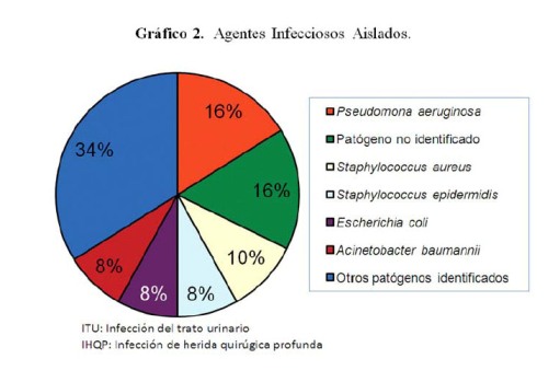 De los pacientes con diagnóstico de IH, ciento tres contaban con estudio serológico o microbiológico. Sesenta y dos pacientes tuvieron aislamiento microbiológico positivo, de ellos 52 pacientes tenían un agente infeccioso identificado al momento del estudio. Pseudomona aeruginosa se aisló en 16,1% siendo el más frecuente, seguido de Staphylococcus aureus en 9,7% (