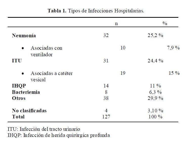Se diagnosticaron 127 IH: ciento trece con una, cuatro con dos y dos pacientes con tres infecciones hospitalarias, los tipos de IH se muestran en la tabla 1. De las 127 infecciones hospitalarias diagnosticadas cuatro no fueron clasificadas, de las 123 restantes la IH más común fue neumonía en 25,2% , seguida por infecciones de tracto urinario en 24,4% , infección de herida quirúrgica profunda 11% y bacteriemia 6,3% (