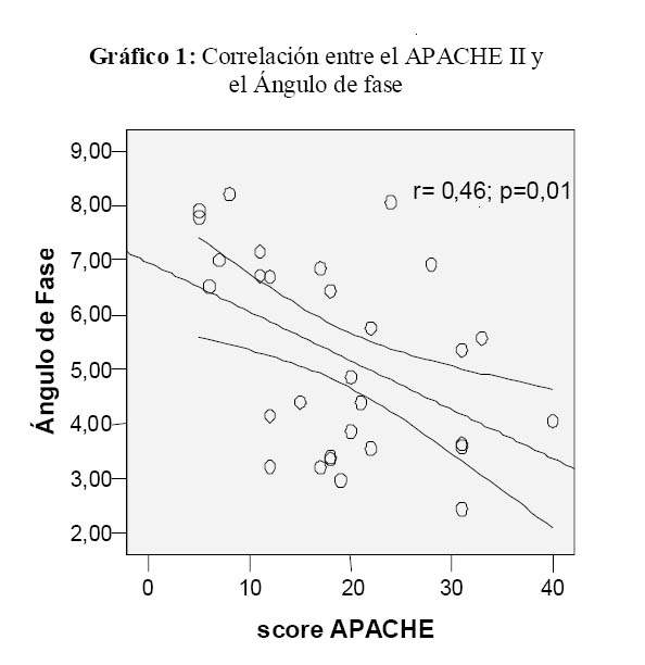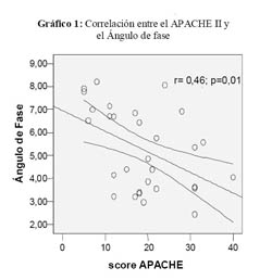 La correlación de Pearson entre el ángulo de fase y el score APACHE II, se da de forma negativa, siendo estadísticamente significativo (r = -0,46 p<0,05) (