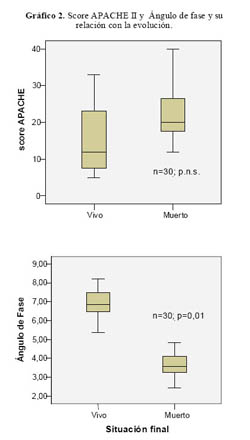 Al estudiar asociación entre la mortalidad y el ángulo de fase o score APACHE II, solamente hubo significancia estadística con el AF p=0,01. El score APACHE no tuvo significancia estadística p= 0,078 (