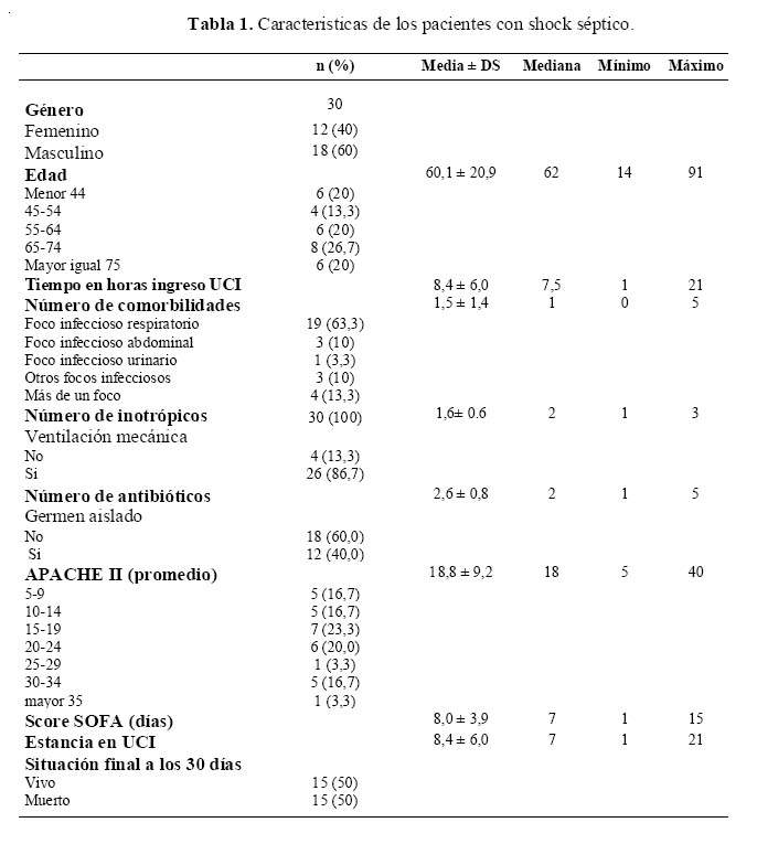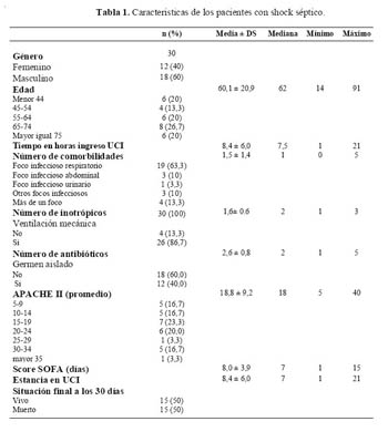 septic shock. Material and methods: We included 30 patients > 14 years old with septic shock admitted to the Adults intensive care unit (ICU) at the
