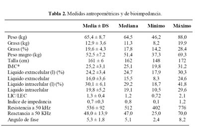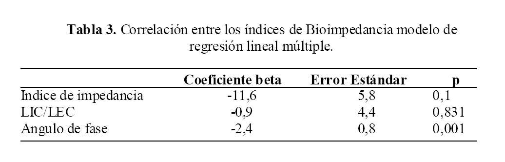Los resultados de la bioimpedancia se muestran en la Tabla 2. En el análisis de correlación utilizando el modelo de regresión lineal múltiple se encontró que de los tres índices de bioimpedancia estudiados, sólo alcanzó diferencia significativa el ángulo de fase (p = 0,001) (