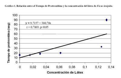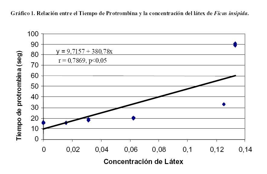 Muchos investigadores han estudiado el contenido enzimático de este látex, el cual recibió el nombre de Ficina (3,23-25). Ésta pertenece a la superfamilia de cisteino proteasas, compartiendo propiedades físico-químicas similares con la Bromelaina. Se ha reportado que la Bromelaina tiene un efecto anticoagulante producido por la reducción del factor X y factor II (protrombina) ambos componentes de la vía final común de la coagulación sanguínea, también provoca una reducción dosis dependiente del quininógeno de alto peso molecular y pre-calicreína, los cuales participan como aceleradores del inicio de la vía intrínseca de la coagulación (26). La Bromelaina en concentraciones altas prolonga marcadamente el TP y TTPa, y su efecto fibrinolítico se debe a que estimula la conversión del plasminógeno en plasmina (26). Debido al alto contenido de Ficina en el látex de Ficus insipida y que ésta posee propiedades similares con la Bromelaina, podríamos inferir que esta enzima seria la responsable del efecto anticoagulante in vitro.
