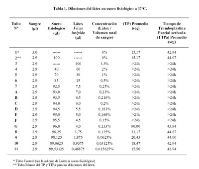 Se prepararon diferentes diluciones del látex en suero fisiológico a 37°C como se muestra en la tabla 1, del tubo 1 al 4 y del tubo A al G, se midieron los volúmenes directamente con micropipeta, a partir de la concentración de látex del tubo 5 se hicieron diluciones sucesivas al medio para obtener los volúmenes y concentraciones que se muestran en los tubos 5 al 11. A continuación se extrajeron las muestras de sangre venosa periférica según técnica estándar, utilizando para la anticoagulación tubos de 4,5 ml. (VacutainerÒ ) conteniendo 0,5 ml. de Citrato de Sodio al 3,2%, de éstos se extrajo 3 ml. de sangre para agregarlos al tubo Nº1 y 2,9 ml. al resto de los tubos, luego se centrifugaron para separar los elementos formes y el plasma, repitiéndose este procedimiento para todas las muestras de sangre venosa obtenidas. Seguidamente, se mezcló el plasma de tubos análogos (tubos con concentraciones similares del látex pero con muestras de sangre de los 5 diferentes donantes) obteniendo así un pool de plasma para cada concentración del látex. Acto seguido, se realizaron las mediciones del tiempo de protrombina (TP) y el tiempo de tromboplastina parcial activada (TTPa), haciendo 3 repeticiones para cada tubo en las diferentes concentraciones del látex. Se siguieron estrictamente las instrucciones del protocolo provisto por el fabricante.