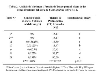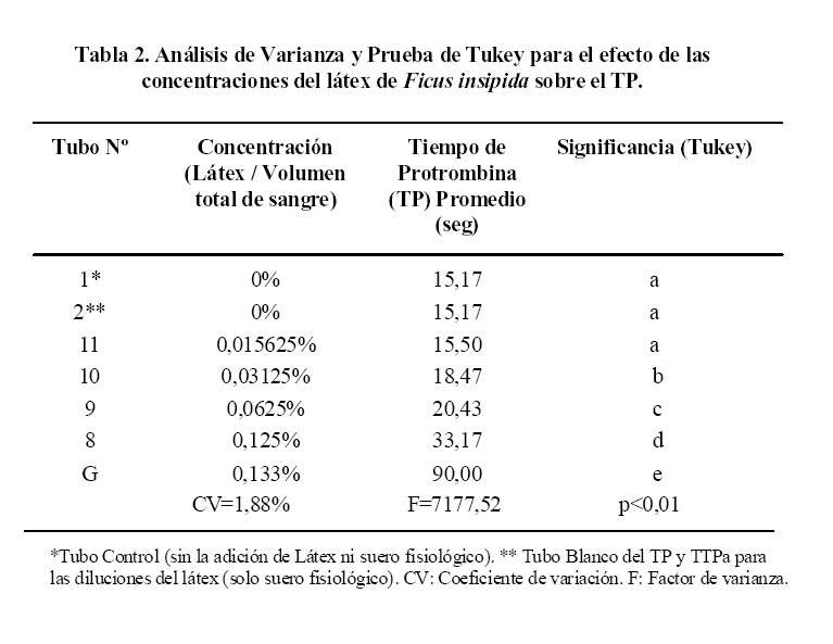 El análisis de varianza para el TP (Tabla 2), mostró que no había diferencia estadística significativa entre los valores de TP obtenidos en los tubos 1, 2 y 11, indicando que el suero fisiológico y el látex a una concentración de 0,015625% no tenían efecto inhibitorio sobre el TP. En cambio, se encontró diferencia significativa en el TP de los tubos 10, 9, 8 y G (p<0,01). Además, se encontró una relación positiva entre la concentración del látex y el TP(r=0,7869; p<0,05) (
