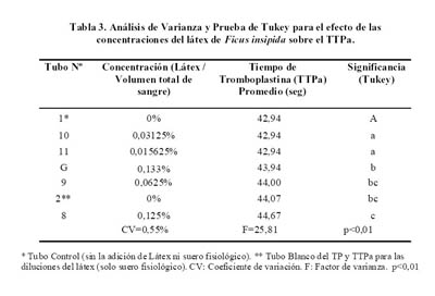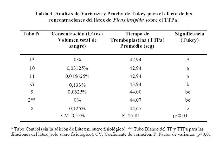 No se encontró diferencia estadística significativa entre los valores de TTPa del tubo control y aquellos con concentración de látex de 0,015625% y 0,03125% (tubos 11 y 10) (Tabla 3). Finalmente, a concentraciones de látex mayores a 0,15% el TP y TTPa fueron mayores de 24 horas (tubos 3 al F).