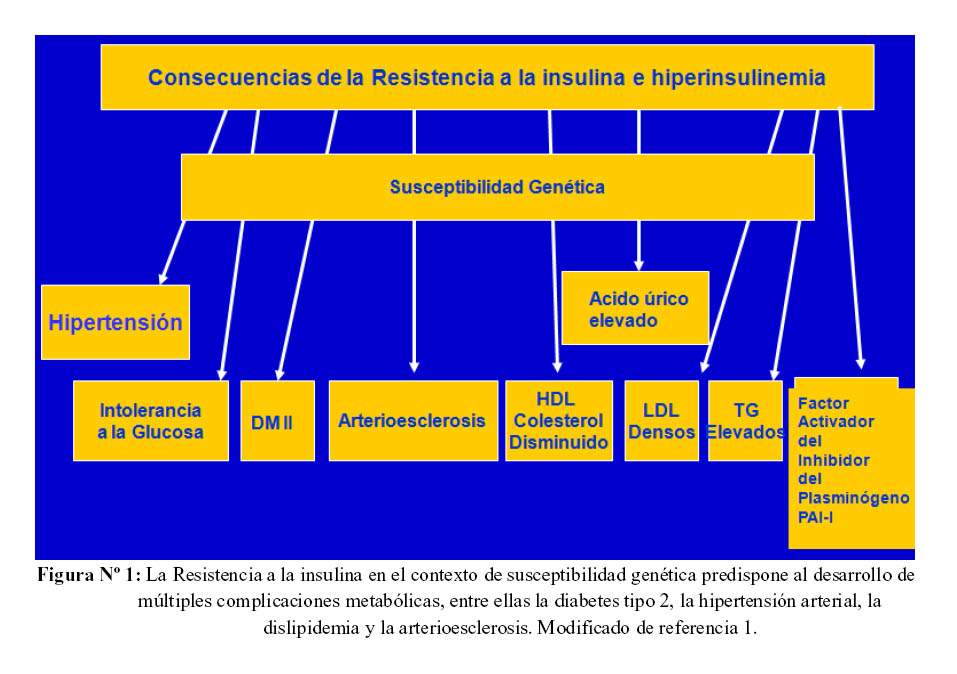 La resistencia a la insulina asociada a factores de susceptibilidad genética condicionan una serie de alteraciones clínicas: hipertensión arterial, intolerancia a la glucosa que en última instancia deriva en diabetes mellitus tipo 2, arterioesclerosis como consecuencia de la disminución del colesterol HDL, la elevación del LDL y de los triglicéridos (1) (Figura 1).