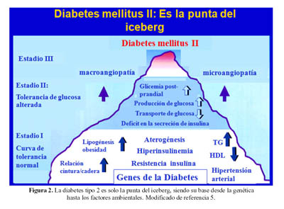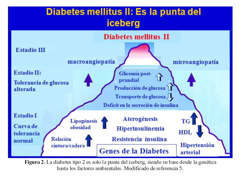 La diabetes mellitus tipo 2 (DM2) es la punta del iceberg, que tiene un primer estadio, algunas de las alteraciones ya mencionadas, la curva de tolerancia a la glucosa (CTG) aun es normal, en presencia de hiperinsulinemia y los individuos muchas veces tienen obesidad, con incremento en la relación cintura – cadera; en esta etapa, se inicia la aceleración del envejecimiento arterial (aterogénesis) y el incremento en la prevalencia de hipertensión arterial. En un segundo estadio, ocurre alteración en la tolerancia a la glucosa, con niveles post prandiales de glucosa elevados, la producción hepática de glucosa se incrementa y el transporte de glucosa al interior de las células disminuye, pues empieza a ocurrir déficit en la secreción de insulina. En un tercer estadio, la diabetes mellitus se hace clínicamente detectable y se incrementa la presencia de macroangiopatia y microangiopatia que ya ocurren en individuos con CTG alterada, para aumentar en proporciones desmesuradas cuando la DM está mal controlada (5) (Figura 2).