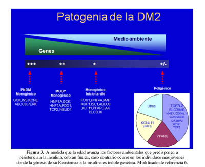 La DM2 es una enfermedad de presentación muy diversa, con alteraciones genéticas que definen la edad de su aparición clínica y la importancia relativa de sus alteraciones en relación con factores ambientales (alimentación y obesidad). Los casos de DM2 con alteración monogénica son raros y se presentan desde el nacimiento hasta la adolescencia; en ellos el factor obesidad es secundario (6). En las formas del adulto la influencia del medio ambiente cobra mucha mayor importancia (Figura 3).
