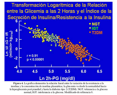 La historia natural de la DM2 del adulto se caracteriza por ser poligénica, con una progresiva disminución de la secreción de la insulina asociada a la alteración paulatina del control de la glicemia; la alteración de la enfermedad es gradual (6) (Figura 4).