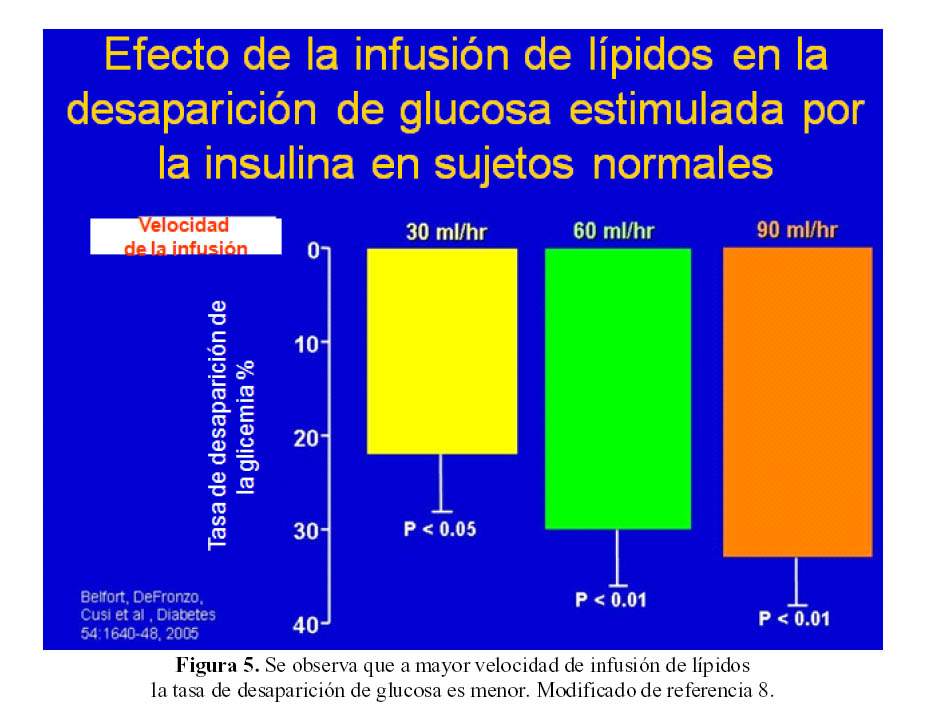 Estudiando el efecto de la infusión de lípidos sobre la desaparición de glucosa sanguínea estimulada por la insulina en sujetos normales, se observó que conforme se incrementaba la velocidad de infusión de lípidos, ocurre una menor caída de la glicemia (Figura 5) lo que permite afirmar que los ácidos grasos disminuyen de manera importante el metabolismo de glucosa en el músculo (7).