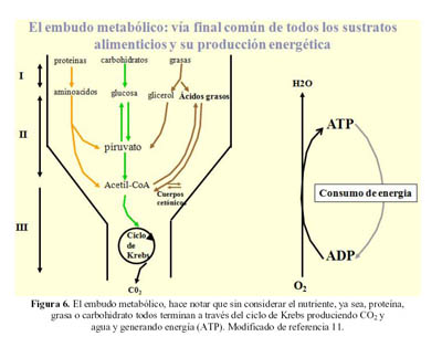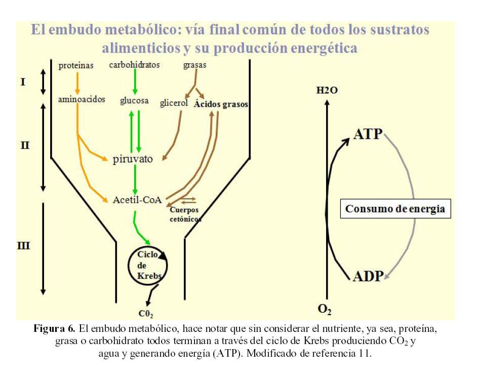 Las mitocondrias son el embudo metabólico de las células, son las organelas donde se produce la energía de todo el organismo. En ellas ocurre la interconversion entre los diferentes sustratos: aminoácidos, glucosa, glicerol y ácidos grasos en el ciclo de Krebs. La actividad mitocondrial genera energía en la forma de ATP; para esto en condiciones normales, el consumo de oxigeno esta acoplado íntimamente a la generación de ATP y a la producción de agua (Figura 6).
