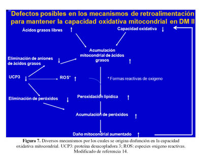 Existen varios defectos en los mecanismos de retroalimentación para mantener la capacidad oxidativa mitocondrial en DM2 (Figura 7): a) la elevación de los ácidos grasos libres lleva a la acumulación mitocondrial de ácidos grasos; contribuye a esto, b) la disminución en la función de la proteína desacopladora tipo 3 (UCP3) que condiciona disminución en la eliminación de aniones de ácidos grasos, c) la disminución de la actividad de UCP3 incrementa la producción de formas reactivas de oxigeno que aumentan la peroxidacion lipidica, d) lo cual redunda en incremento de el daño mitocondrial, que conlleva e) una disminución en la capacidad oxidativa celular (14).