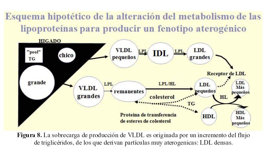 El exceso de ácidos grasos que afluyen al hígado causa un incremento en la síntesis de VLDL y como resultado (Figura 8) del catabolismo del VLDL "grandes", se producen en última instancia LDL "densos". Los LDL "densos" tienen una mejor capacidad de infiltrar la pared arterial que los LDL menos "densos" y también dan productos de peroxidacion (ROS) (15).