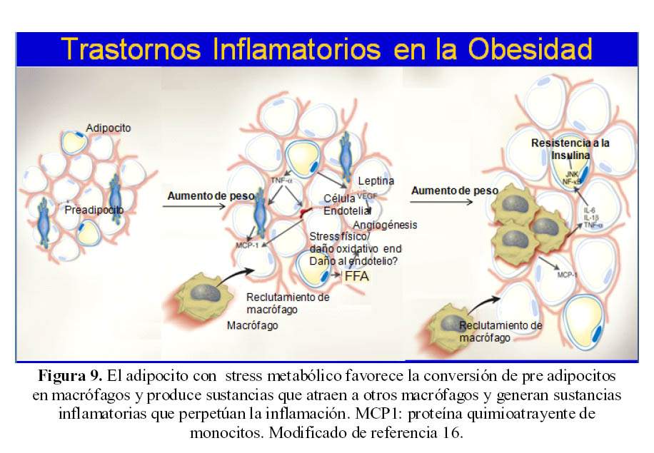 Durante el proceso inflamatorio en el tejido adiposo, los adipocitos secretan pequeñas cantidades de TNF que estimula a los pre adipocitos a producir MCP 1 (proteína quimioatrayente de monocitos) que atrae el ingreso de monocitos, el mismo fenómeno es generado por células endoteliales (16).
