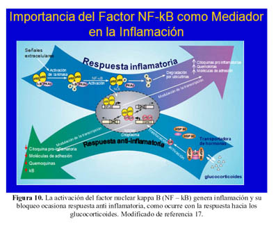 La activación del factor nuclear kappa B (NF kB) es el eje del que dependen los mecanismos de acción inflamatoria y también sobre el cual inciden los diferentes mecanismos inflamatorios tanto naturales del organismo, así como los medicamentos que usamos como agentes inflamatorios (17) (Figura 10).