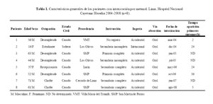 En la tabla 1 se muestran las características generales de los pacientes. Seis fueron varones y 2 mujeres, la edad promedio fue 50,0 ± 17,4 años (16 – 71 años), 75% tenía más de 40 años y la mitad se encontraba desempleado.
