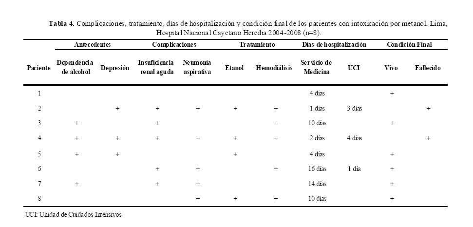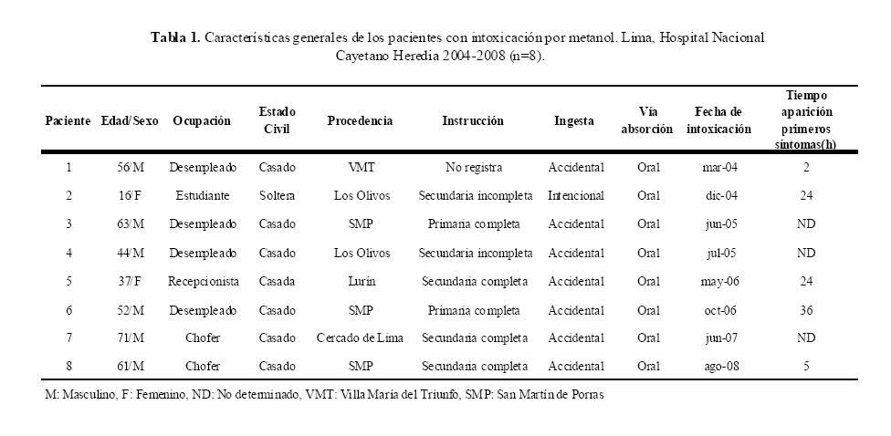 En siete, la intoxicación fue accidental y en uno, intencional. Seis casos tenían la historia de haber consumido licor adulterado. La vía oral fue la vía de ingreso del alcohol metílico en todos los pacientes. Tres pacientes llegaron al hospital después de 24 horas y seis casos ocurrieron entre los meses de junio a diciembre.