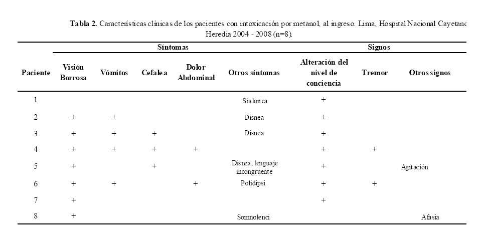 El objetivo del estudio fue determinar las características clínicas y la evolución de los pacientes con intoxicación por metanol atendidos en un hospital general.