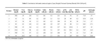 Los dos pacientes fallecidos tenían pH sanguíneo menor de 7,0. Un estudio encontró relación entre los niveles de pH sanguíneo y mortalidad (23). Ambos pacientes tenían además insuficiencia renal.