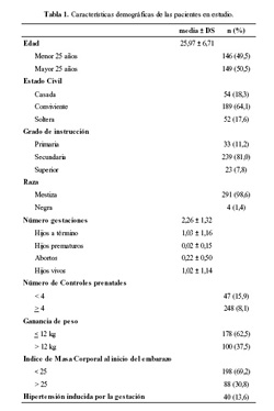 De 304 pacientes hospitalizadas durante el periodo de estudio, se incluyeron 295. Se excluyeron tres pacientes con embarazo gemelar, dos portadoras del VIH, tres con edad gestacional menor a 30 semanas, y una por llenar inadecuadamente los cuestionarios. Las características demográficas de nuestra población se encuentran representadas en la tabla 1.